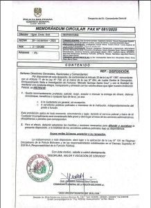 En el memorándum se señala que todas las actividades operativas y administrativas deberán finalizar “en el día”, y que se deberá elaborar un inventario detallado del mobiliario, equipos, armamento, vehículos u otros bienes, los cuales deberán ser entregados a la unidad administrativa.